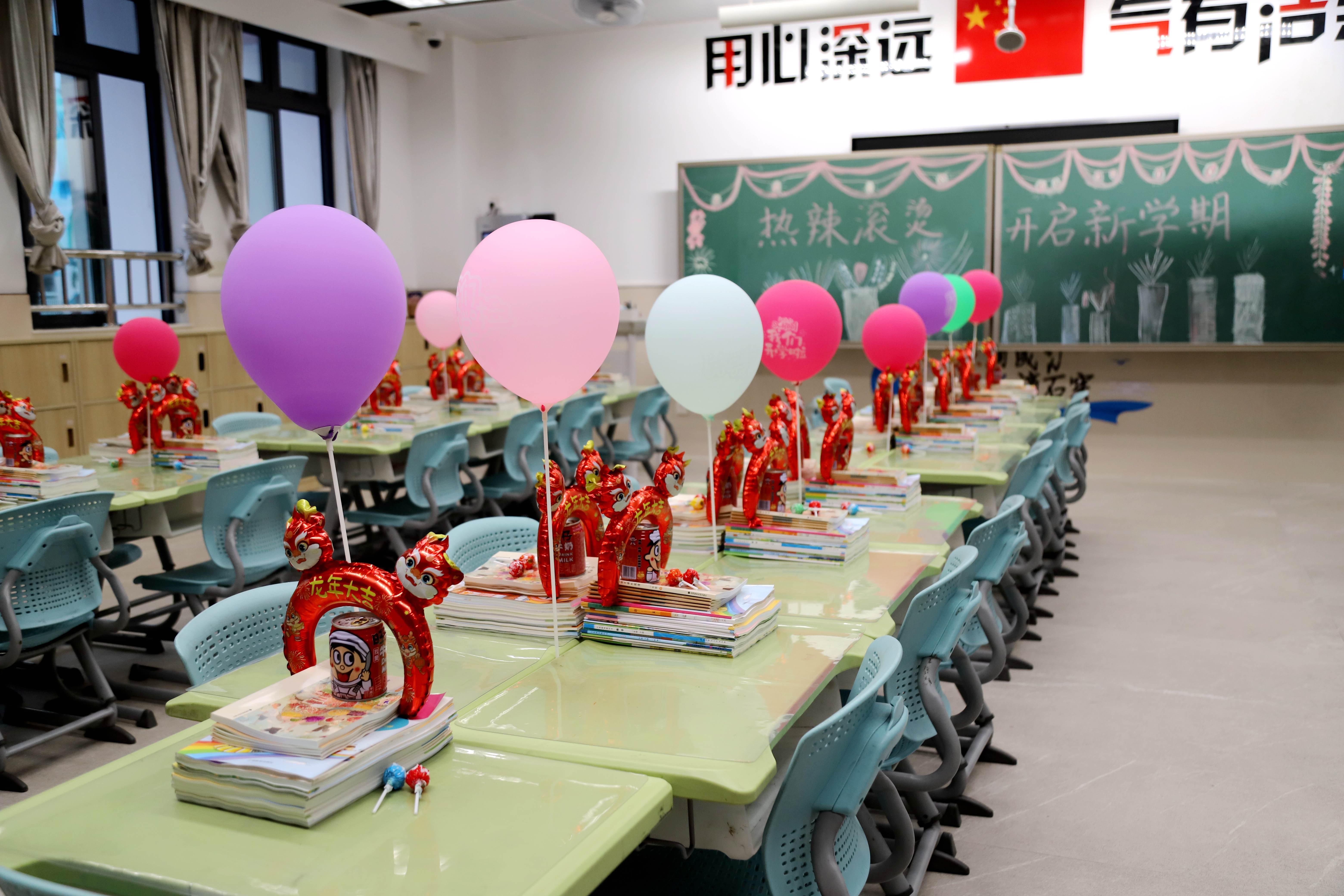 走进校园,各班老师别出心裁地布置好教室,各不一样。或是给学生送去一束葱、一棵芹菜,寓意新学期的生活郁郁葱葱,大家勤勤恳恳投入学习;或是在黑板上将装着新年祝福语的红包排成龙形,孩子们轮流揭下,念出祝福;或是给孩子们戴上龙角头饰,一齐对着镜头喊出新年愿望……