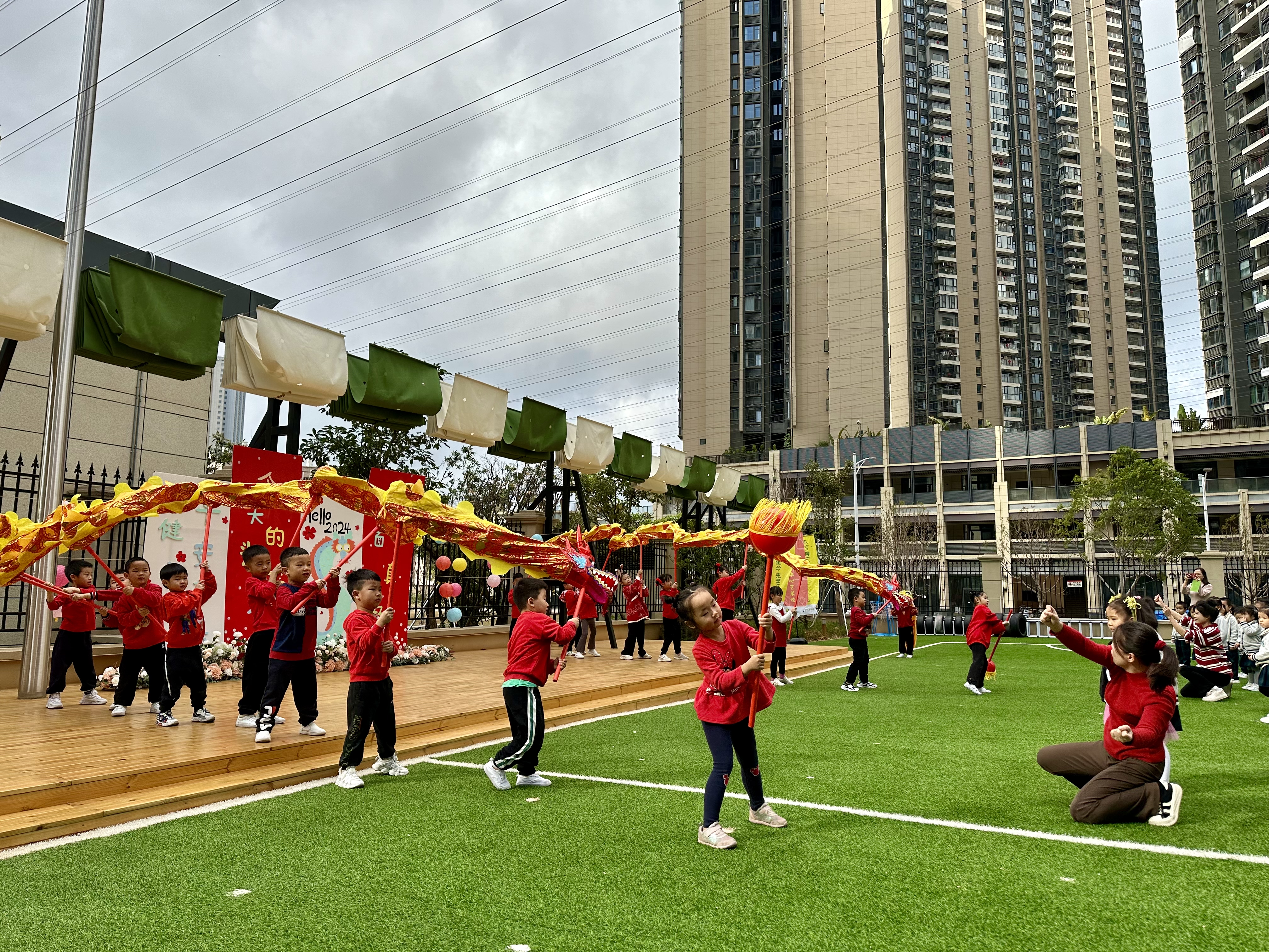 坪山区联馨幼儿园里金龙翻腾、喜气洋洋,孩子们争相抚摸龙头、龙尾,祈愿新年步步高。不仅如此,幼儿园还安排了内容丰富、精彩多样的活动,希望孩子们在参加既喜庆又充满趣味的活动过程中,能够感受到自己的变化和成长,也能够生发出对新学期的期待和锐意进取的精神。
