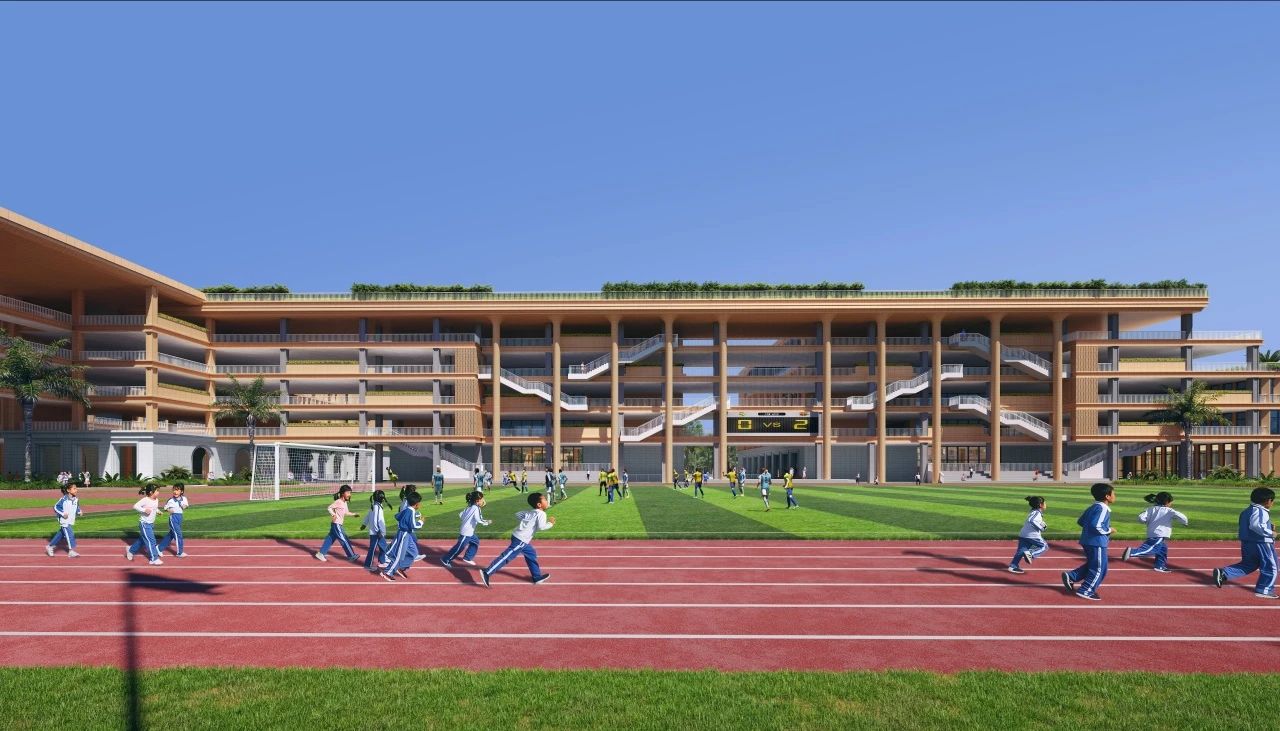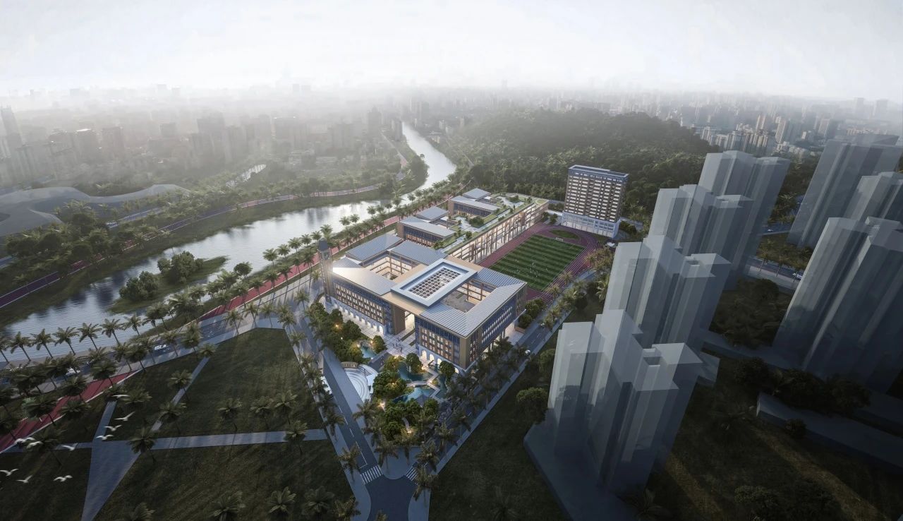 校园设计以“山水方舟”为核心理念,设计以山之脉络为校园之脉络,通过中央学习街串联起各个庭院与建筑群,以水为脉络联系各个景观庭院,既有江南园林之韵,又有岭南自然之美。整体校园建筑群以舟为形,犹如在坪山河畔扬帆起航。学校设有报告厅、健身房、教师宿舍、各类球馆以及与餐厅相结合的校园图书馆,教学楼每层设有年级组办公室以及大小会议室、讨论室,并且每个班级边上配备有独立的班主任办公室,功能齐全完善,各具特色。