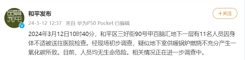 @和平发布 微博消息,2024年3月12日10时40分,和平区三好街90号甲百脑汇地下一层有11名人员因身体不适被送往医院检查。经现场初步调查,疑似地下室供暖锅炉燃烧不充分产生一氧化碳所致。目前,人员均无生命危险。相关情况正在进一步调查中。