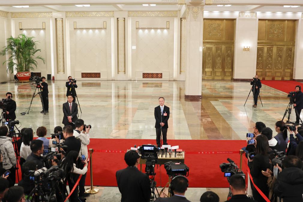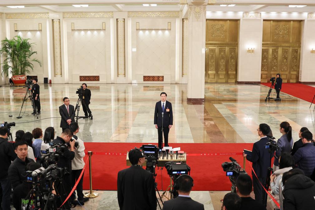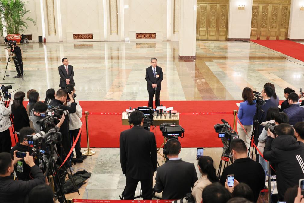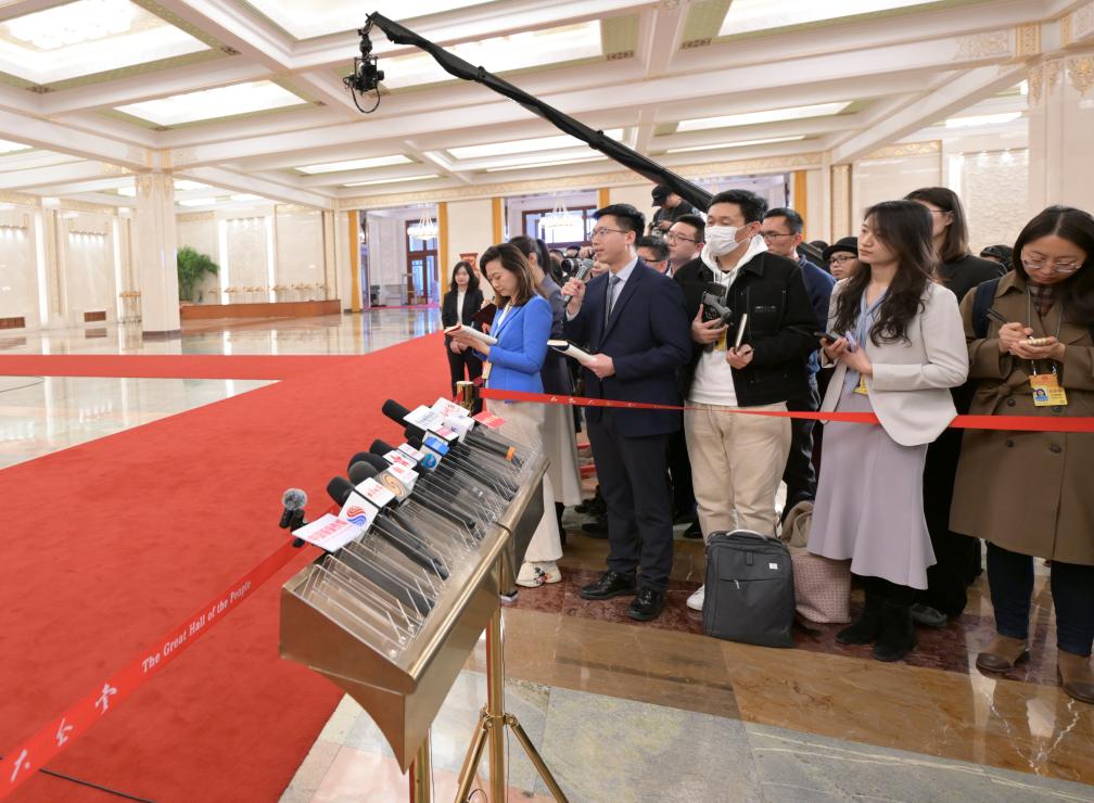 3月11日,第十四届全国人民代表大会第二次会议第三场“部长通道”集中采访活动在北京人民大会堂举行。这是记者在现场采访拍摄。