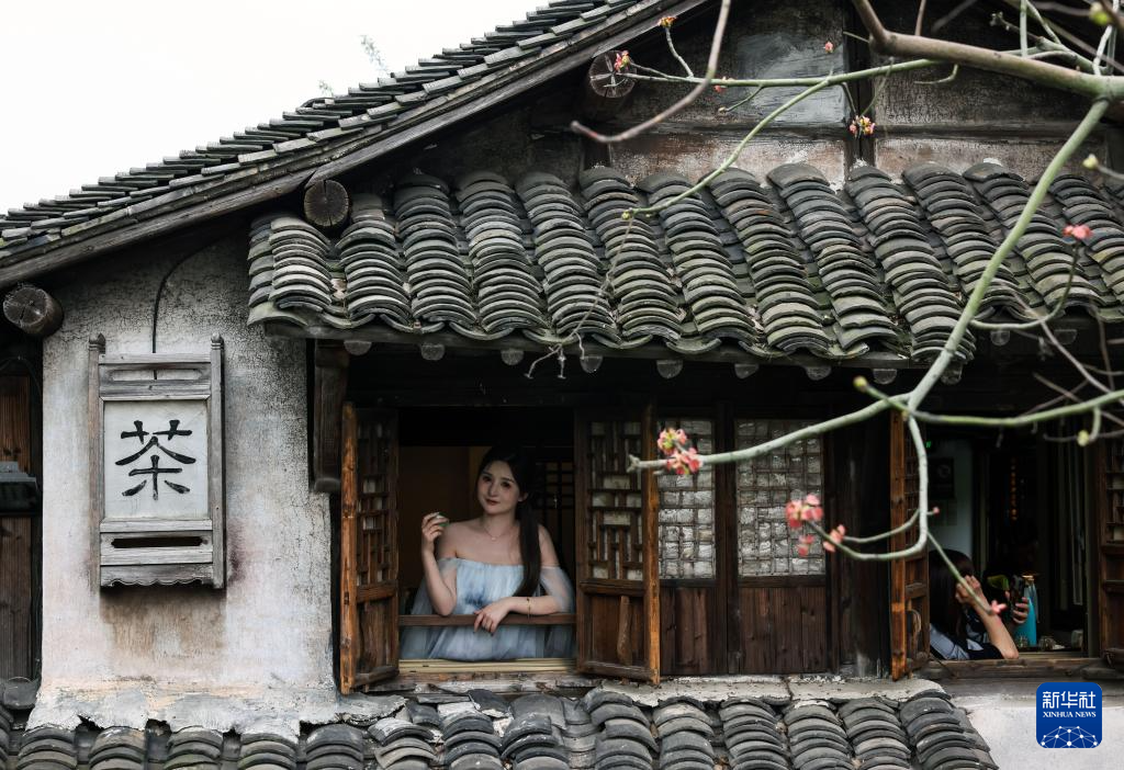 4月11日,游客在水乡乌镇的一间茶楼里向外眺望。新华社记者 兰红光 摄