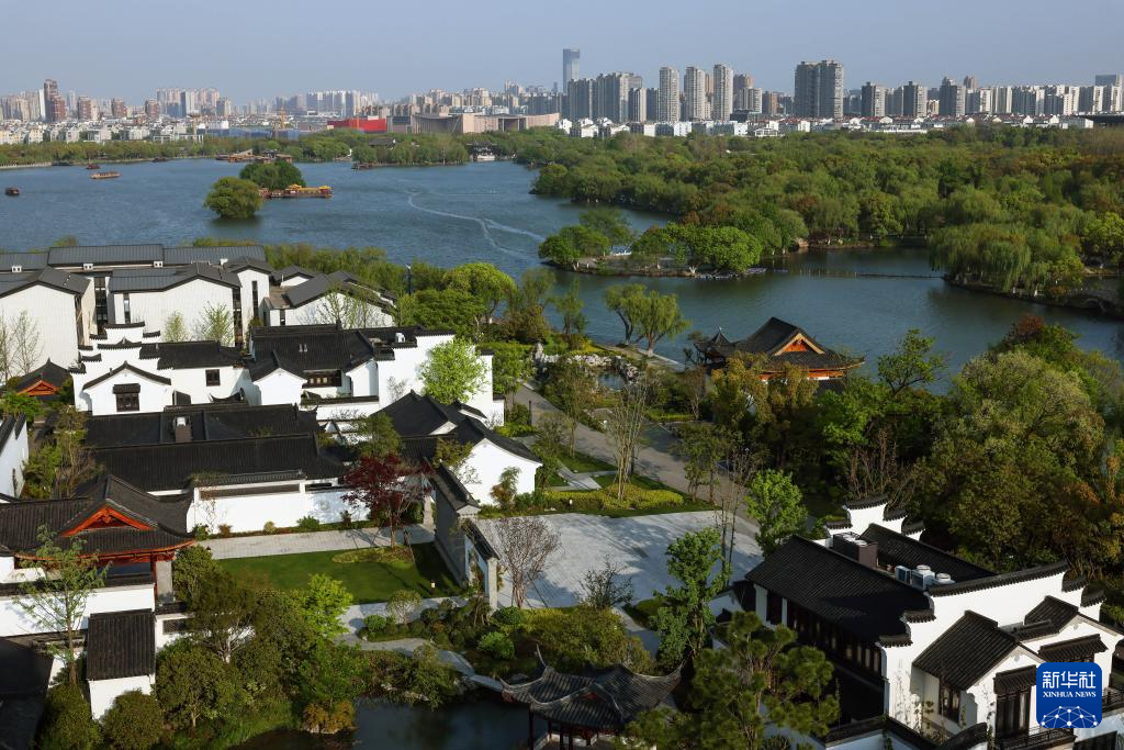 4月10日,在嘉兴市南湖壕股塔上拍摄的嘉兴景色,江南徽派建筑和现代化城市建筑尽收眼底。新华社记者 兰红光 摄