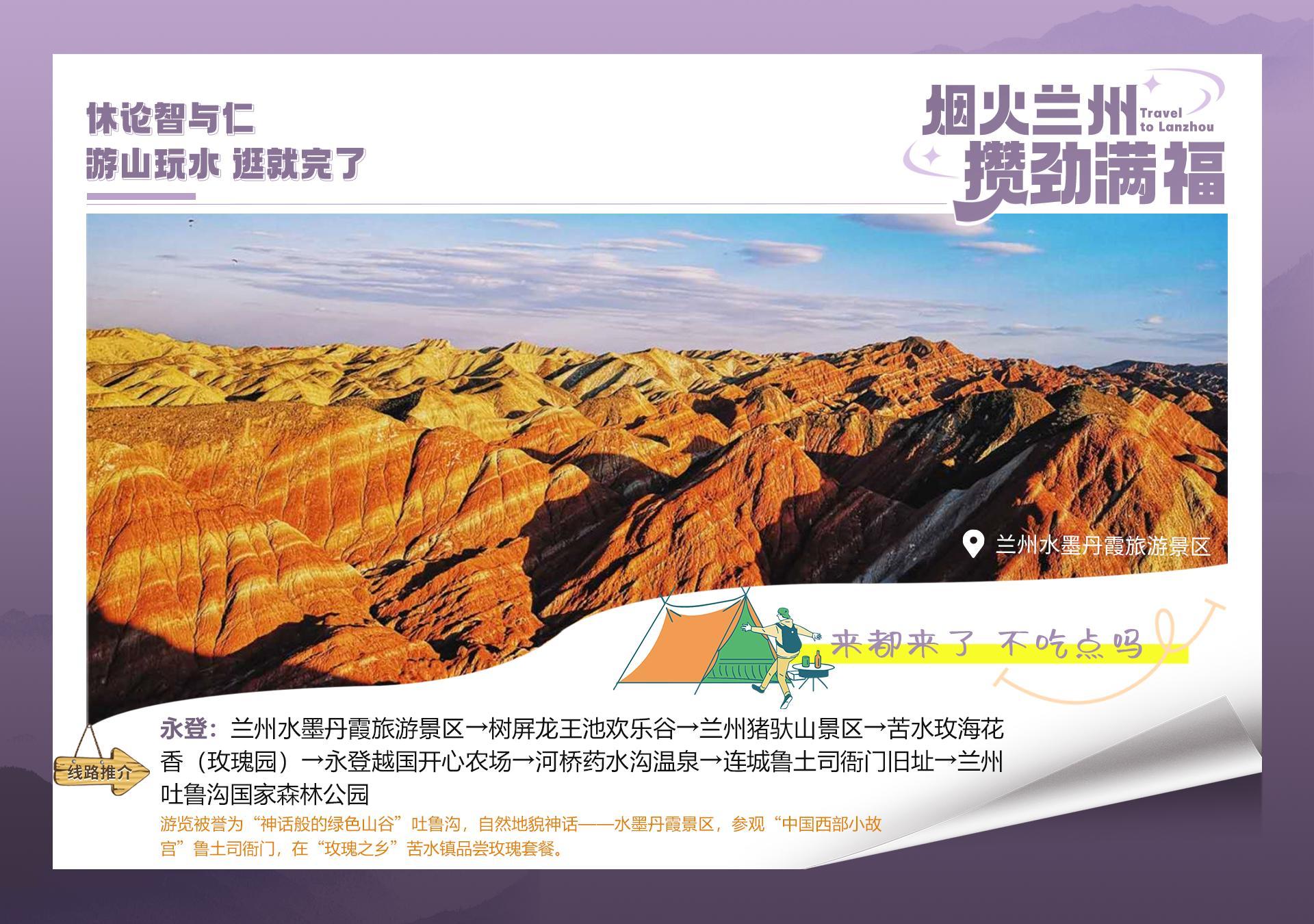 6.永登:兰州水墨丹霞旅游景区→树屏龙王池欢乐谷→兰州猪驮山景区→苦水玫海花香(玫瑰园)→永登越国开心农场→河桥药水沟温泉→连城鲁土司衙门旧址→兰州吐鲁沟国家森林公园