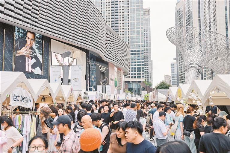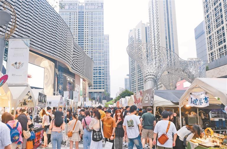 在南山万象天地,顾客们在云南菜馆里三五相聚品尝地道菜肴;罗湖国贸商圈,网红特色美食档口永不缺排队人龙;福田卓悦中心举办全市最大规模户外咖啡市集,200余家咖啡品牌云集,咖啡豆耳环等创意新品吸睛无数。