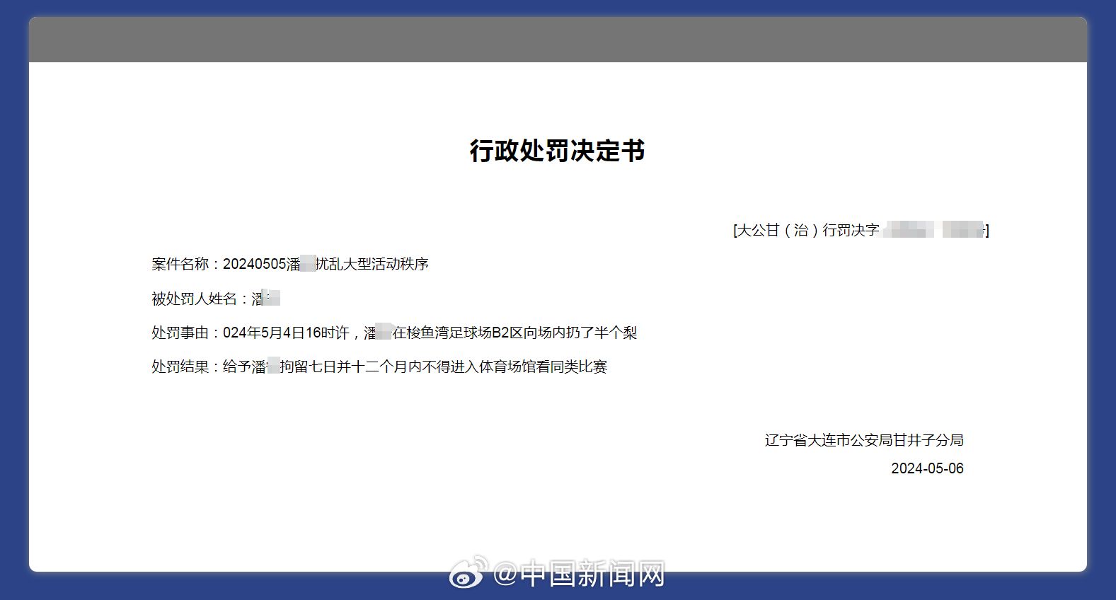 据@中国新闻网 5月6日消息,辽宁省大连市公安局甘井子分局发布行政处罚决定书:球迷潘某在梭鱼湾足球场B2区向场内扔了半个梨,给予潘某拘留七日并十二个月内不得进入体育场馆看同类比赛的处罚。5月4日,中甲大连英博0-1不敌广州队,赛后两队球员爆发冲突。