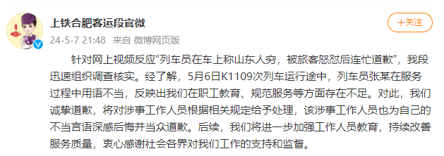 回应中指出,针对网上视频反应“列车员在车上称山东人穷,被旅客怒怼后连忙道歉”,该段迅速组织调查核实。经了解,5月6日K1109次列车运行途中,列车员张某在服务过程中用语不当,反映出该段在职工教育、规范服务等方面存在不足。对此,该段诚挚道歉,将对涉事工作人员根据相关规定给予处理,该涉事工作人员也为自己的不当言语深感后悔并当众道歉。