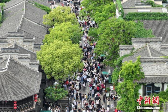 资料图为5月3日,游客们在南京门东老街上游玩。(无人机照片)中新社记者 泱波 摄