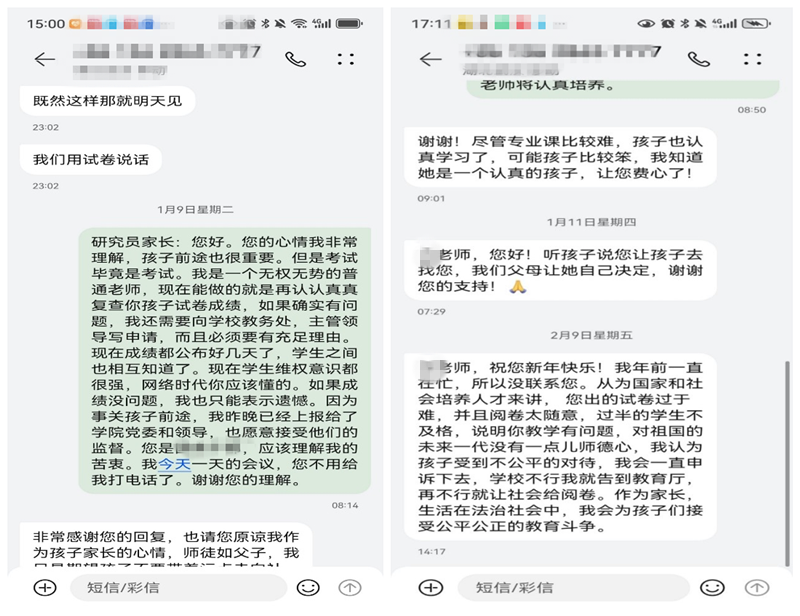 “那几天,我连续接到学院教务员和学院领导的电话、微信,要求为这位同学修改成绩,还多次提到该学生家长是某研究院的院士团队成员。”秦风表示,自己虽然不高尚,但做事绝对有原则。“当时明确表明了自己的态度,分数肯定是改不了。如果能随意修改成绩,那对其他认真听课、备考同学很不公平。”