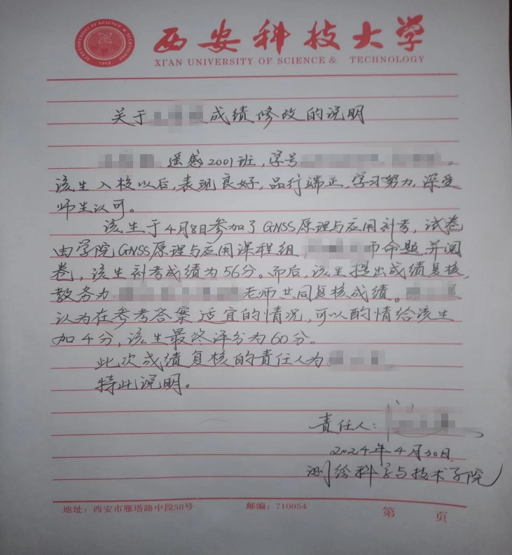 学院教导员签字手写的学生成绩修改说明(受访者供图)