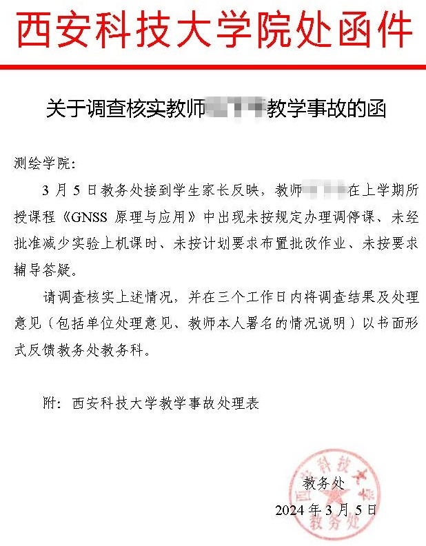 3月5日,学生家长到学校来反映秦风老师的教学方面问题,为此,该学校教务处专门下发了关于调查该事件的函。