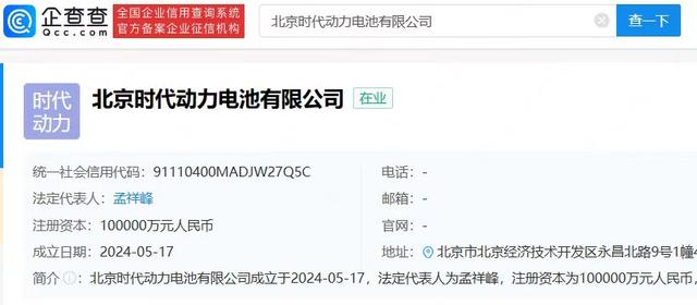 企查查APP显示,近日,北京时代动力电池有限公司成立,法定代表人为孟祥峰,注册资本10亿元,经营范围为电池制造。