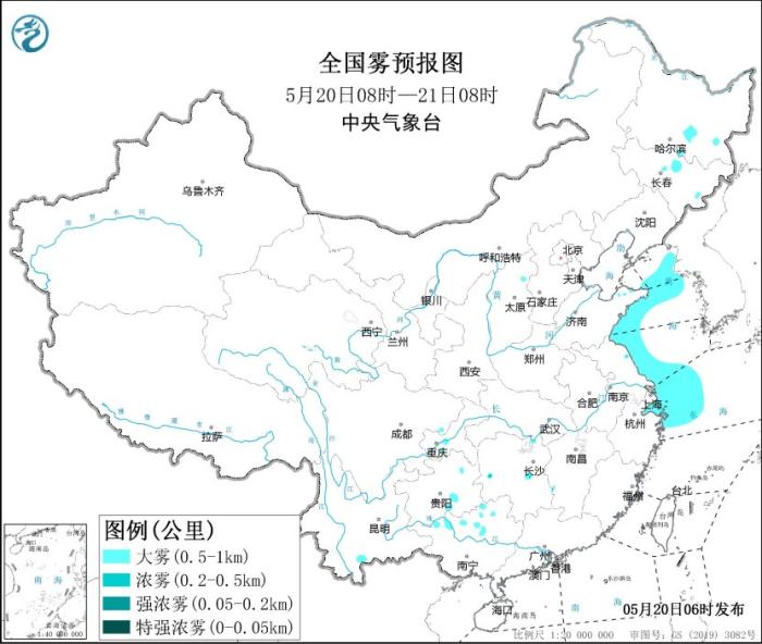 预计,5月20日白天至夜间,黄海大部海域、东海西北部海域、山东半岛东部和南部沿岸海域、江苏沿岸海域、长江口及杭州湾附近海域将有大雾,能见度不足1公里。中央气象台5月20日06时继续发布大雾黄色预警。