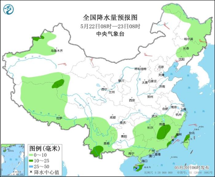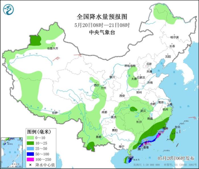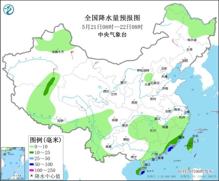 5月20日08时至21日08时,广东中东部、福建大部、江西南部、云南南部、海南岛大部、台湾岛大部以及新疆伊犁河谷等地的部分地区有中到大雨,其中,广东中部和东南部沿海、福建东南部、海南岛东部等地的部分地区有暴雨或大暴雨(100~150毫米)。新疆东部和南疆盆地的部分地区有4~6级风,其中,新疆南疆盆地部分地区有6~7级风。