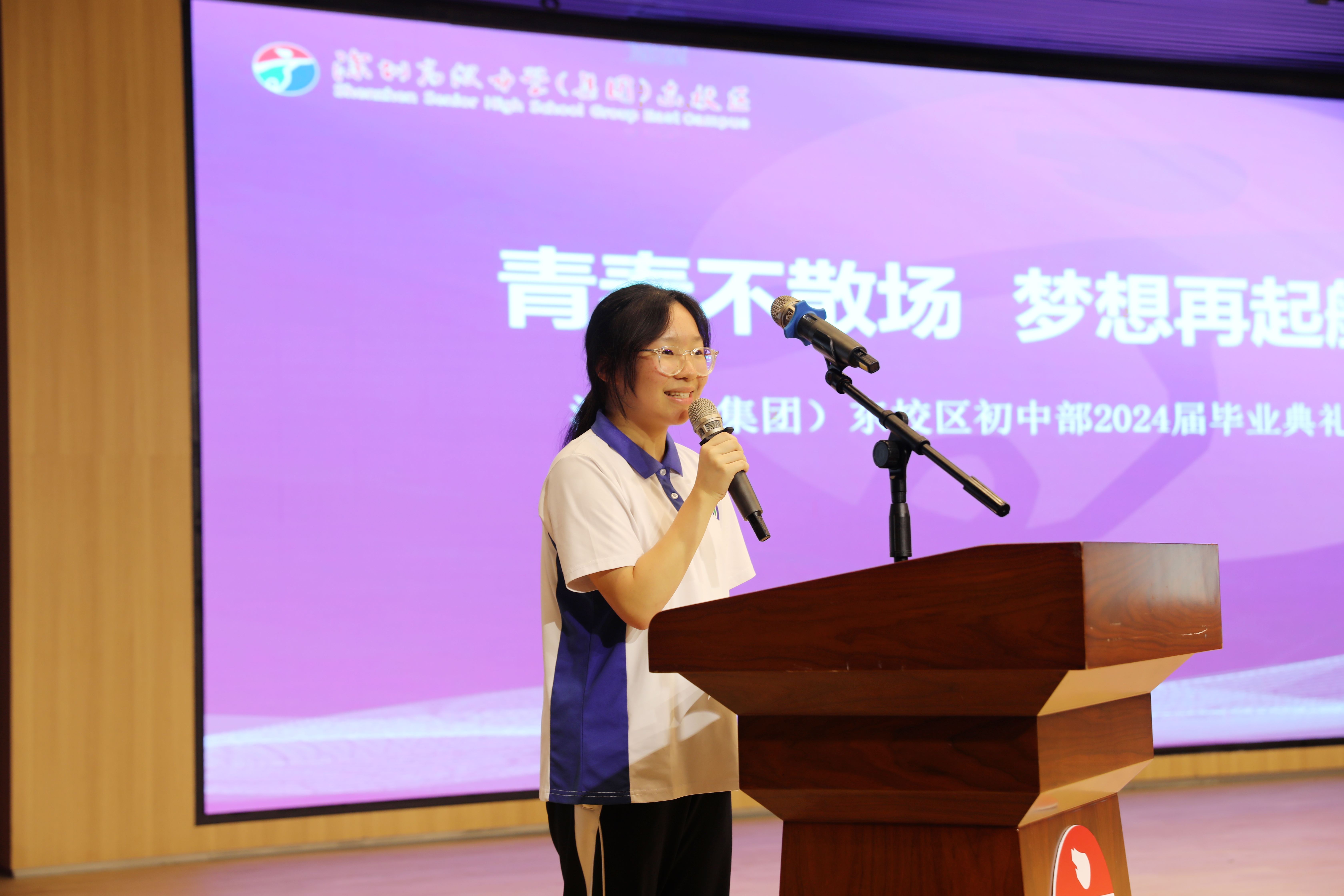 优秀毕业生代表段瑶在发言中表达了对学校辛勤培养和师长关心爱护的感激之情,她表示,深圳高级中学(集团)东校区为学生们提供了优越的环境与饱满的学习氛围,“得益于学校的培养,在紫堡一砖一瓦的见证下,我们顺利完成初中学业,拥抱了人生中一个重要阶段的蜕变。”