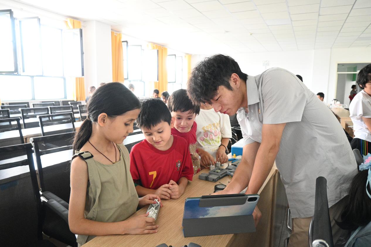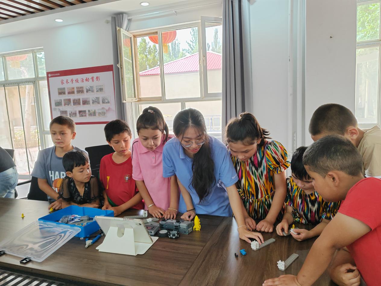 “实践团”大学生远赴新疆维吾尔自治区喀什地区和克孜勒苏柯尔克孜自治州开展社会实践活动,走进帕哈太克里乡4村、玛纳斯社区和吐古买提乡迈丹小学,为当地中小学生开展机器人科普支教活动。