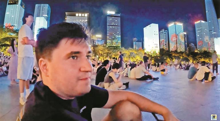 一位外国博主在深圳观看灯光秀。