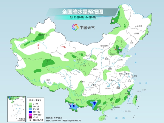 具体来看,今天新疆南疆西北部和天山山区、西藏北部和东南部、青海西部和北部、甘肃中部、内蒙古东北部、河北东北部、北京东部、天津中东部、浙江南部、福建东部、广东北部、广西西部和北部、云南西南部、台湾岛东部等地部分地区有中到大雨,其中,云南西南部、广西西部等地局地有暴雨。