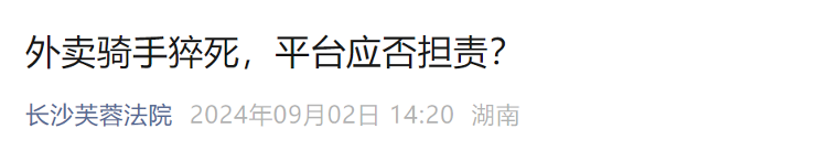 此前,也发生过其他平台外卖员猝死的事件。日前,长沙芙蓉法院官方公众号发布案例显示,一名外卖员在配送过程中晕倒,就医后不幸离世。其家属随后向平台提出赔偿要求,经过法院审理,平台被判定承担20%的赔偿责任。