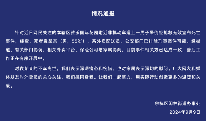 针对近日网民关注的本辖区雅乐国际花园附近非机动车道上一男子晕倒经抢救无效宣布死亡事件,经查,死者袁某某(男,55岁),系外卖配送员,公安部门已排除刑事案件可能。