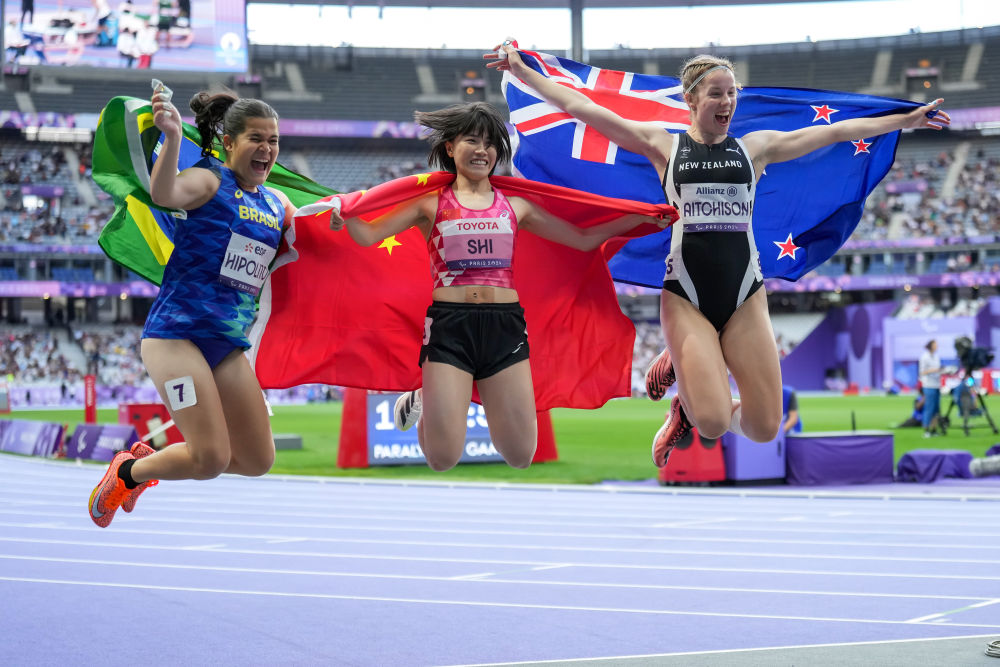 ↑9月4日,田径女子100米T36级冠军中国选手史逸婷(中)、亚军新西兰选手艾奇逊(右)和季军巴西选手伊波利托一同跃起庆祝。新华社记者 张铖 摄
