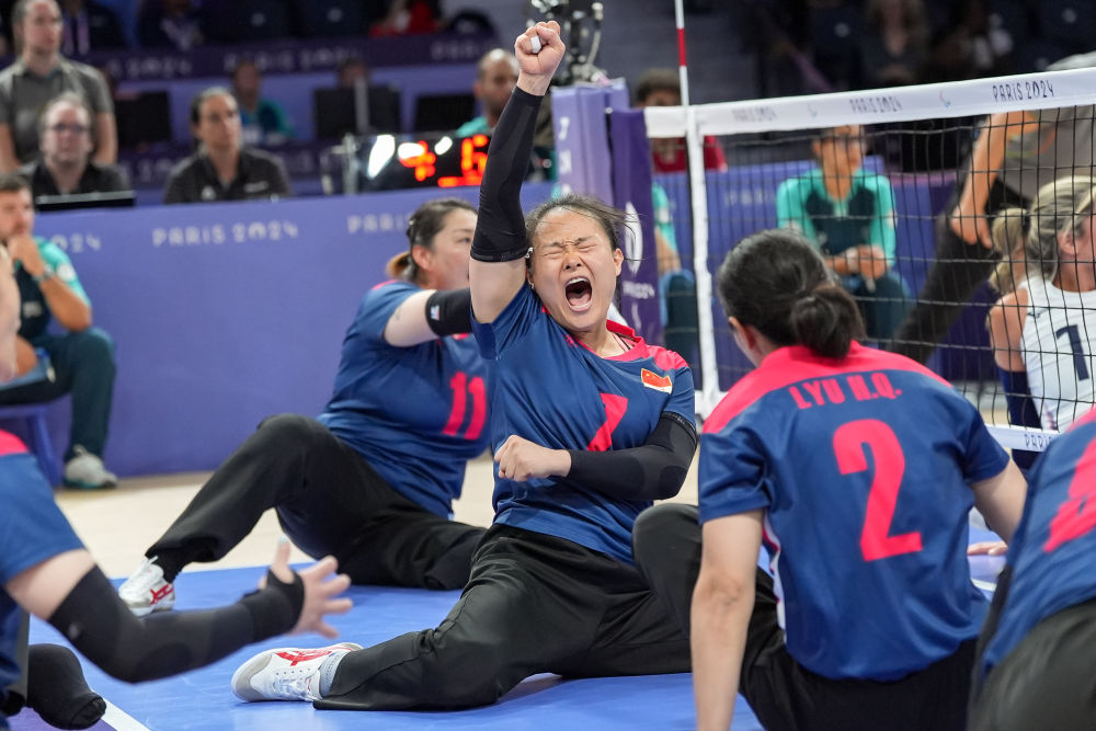 ↑ 9月7日,中国队球员王亚男(中)在女子坐式排球决赛中庆祝得分。新华社记者 张铖 摄