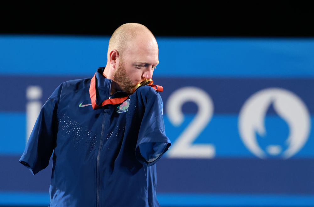 ↑9月1日,来自美国的无臂弓箭手、41岁的马特·斯塔茨曼第四次在残奥会赛场上向冠军发起冲击,最终他获得射箭男子个人复合弓公开级金牌。这是斯塔茨曼在颁奖仪式上亲吻金牌。 新华社记者 侯俊 摄