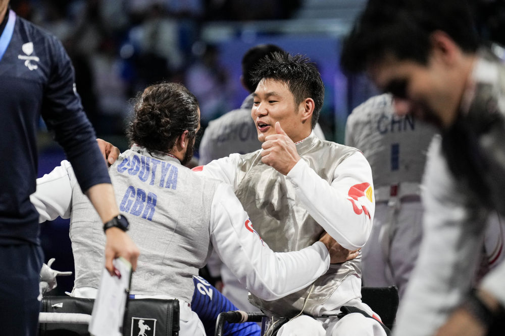 ↑9月5日,中国队选手冯彦可(右二)在颁奖仪式后和英国队选手迪米特里互相祝贺。在轮椅击剑项目男子花剑团体赛决赛中,中国队战胜英国队,获得冠军。新华社记者 张豪夫 摄