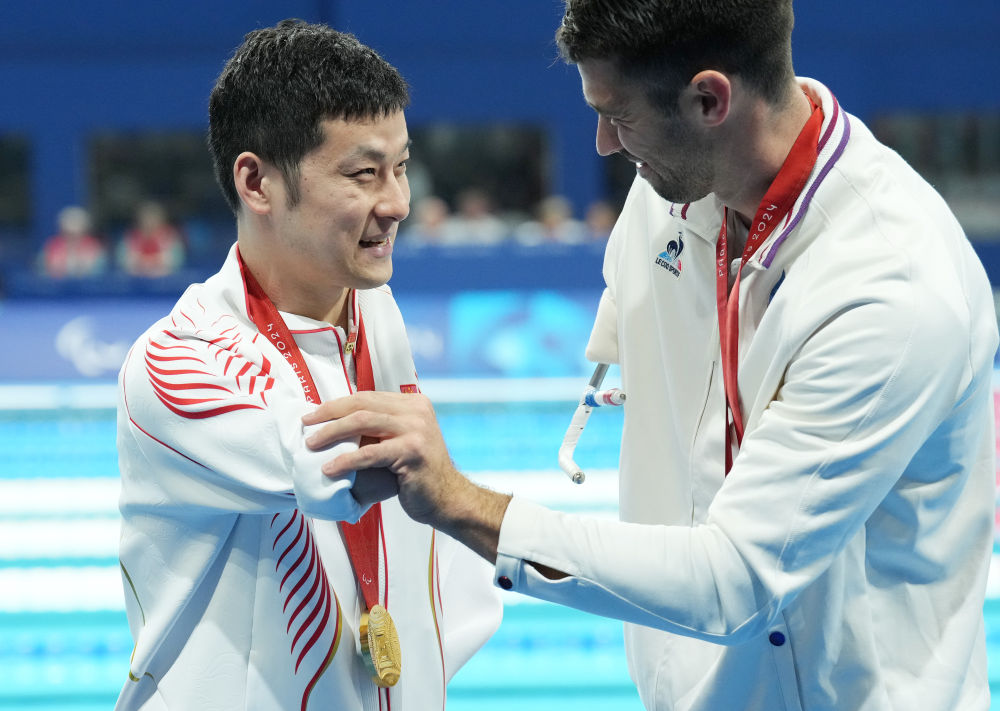 ↑9月3日,游泳男子50米蝶泳S6级季军、法国选手沙达尔(右)与冠军王金刚在颁奖仪式上相互致意。新华社记者 高静 摄
