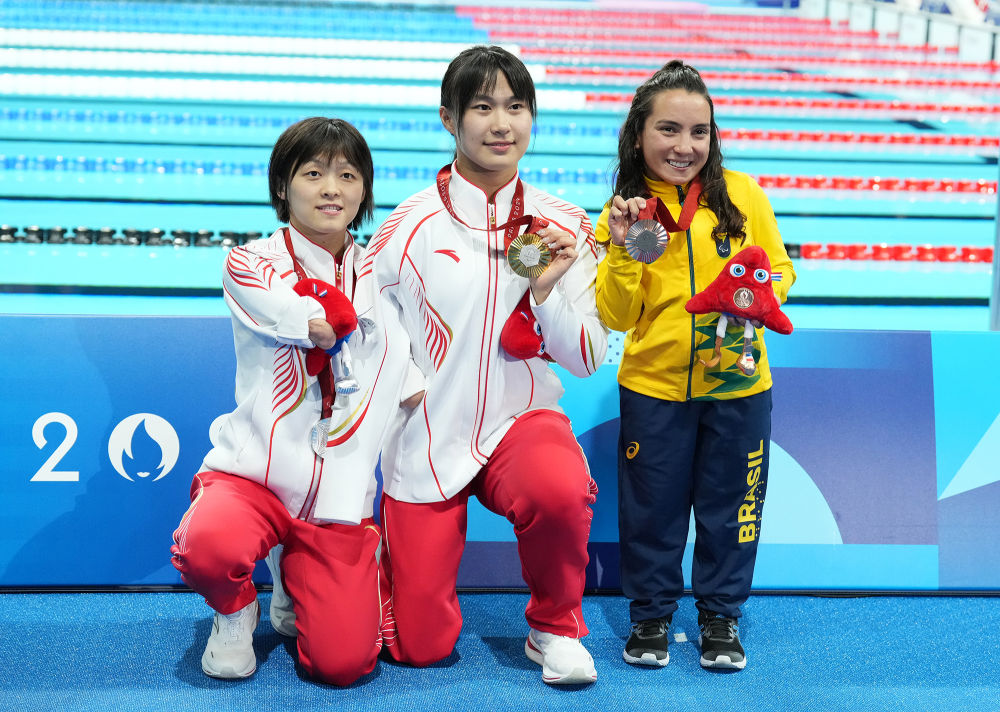 ↑9月3日,游泳女子50米蝶泳S6级冠军中国选手蒋裕燕(中)、亚军中国选手刘道敏(左)蹲下与季军巴西选手佩措尔德合影。 新华社记者 高静 摄