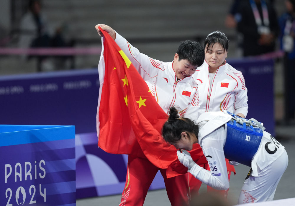 ↑8月30日,中国选手李羽洁(下)夺得跆拳道女子57公斤级K44级金牌后亲吻国旗。新华社记者 涟漪摄