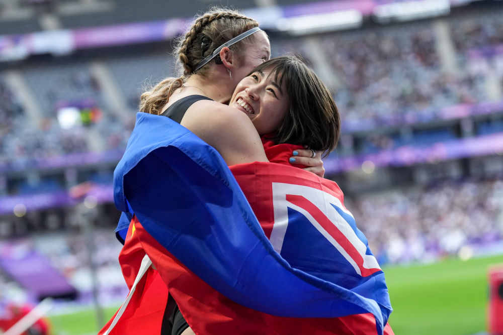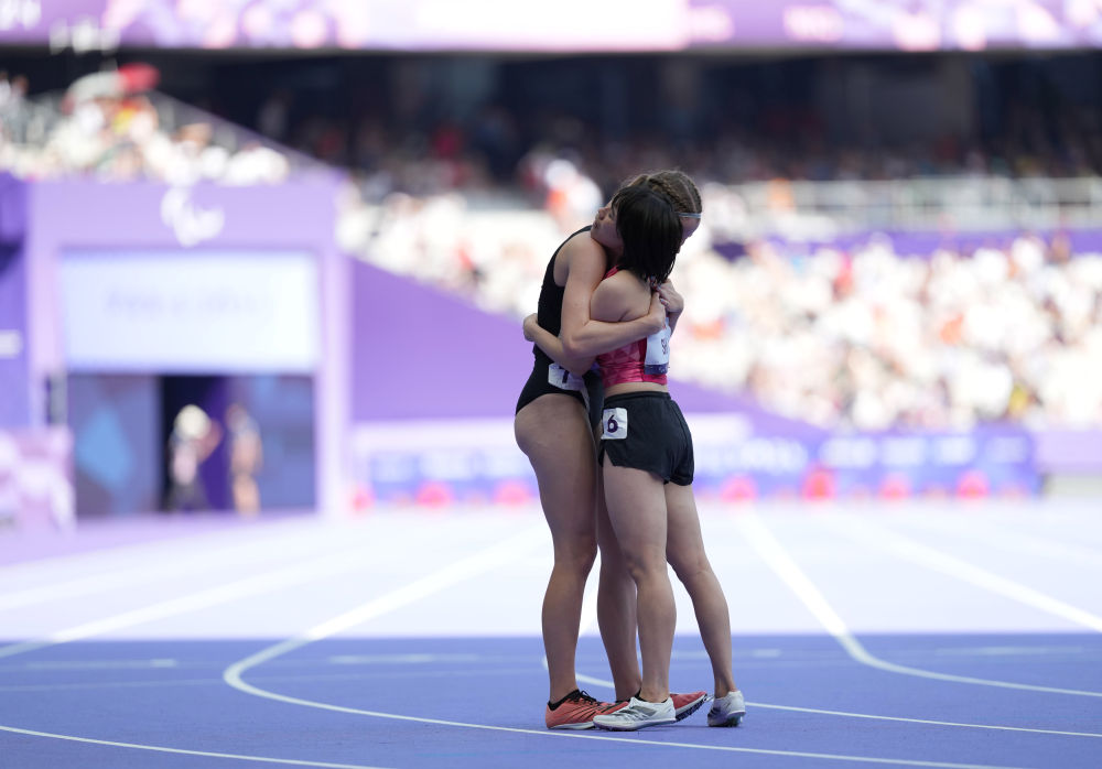 ↑9月1日,田径女子200米T36级冠军中国选手史逸婷(右)在比赛后与获得亚军的新西兰选手艾奇逊拥抱。新华社记者 贺灿铃 摄