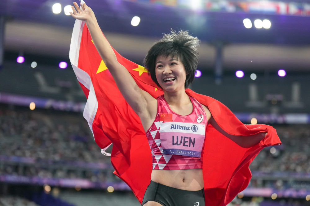 ↑9月1日,夺得巴黎残奥会田径跳远T37级冠军的中国选手文晓燕身披五星红旗庆祝。新华社记者 张铖 摄
