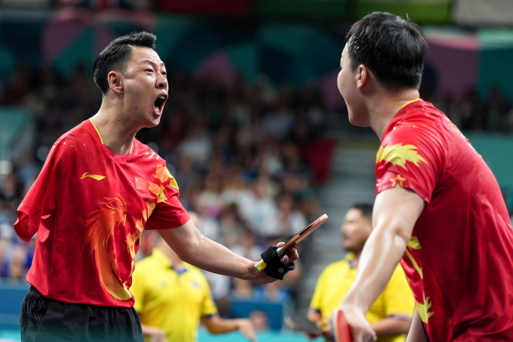 ↑9月1日,中国组合廖克力(左)/闫硕夺得乒乓球男双14级冠军后庆祝。新华社记者 张铖摄