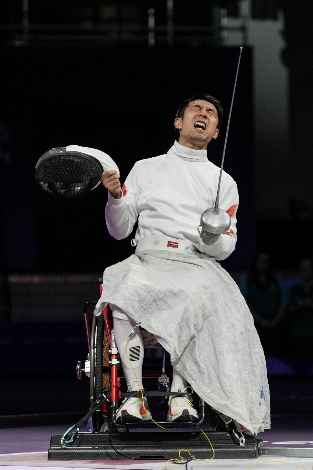 ↑9月6日,中国选手孙刚在获得轮椅击剑项目男子个人重剑A级冠军后庆祝。新华社记者 张豪夫 摄