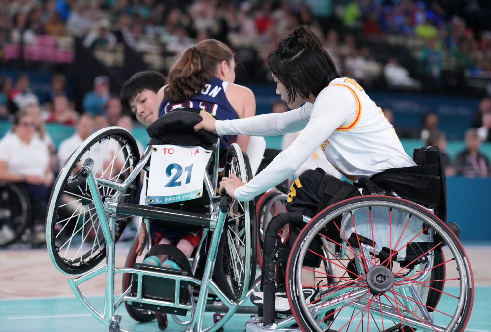 ↑9月6日,中国队球员陈雪静(右)、吕桂娣在轮椅篮球女子半决赛中扶起倒地的美国队球员伊顿(中)。新华社记者 高静 摄