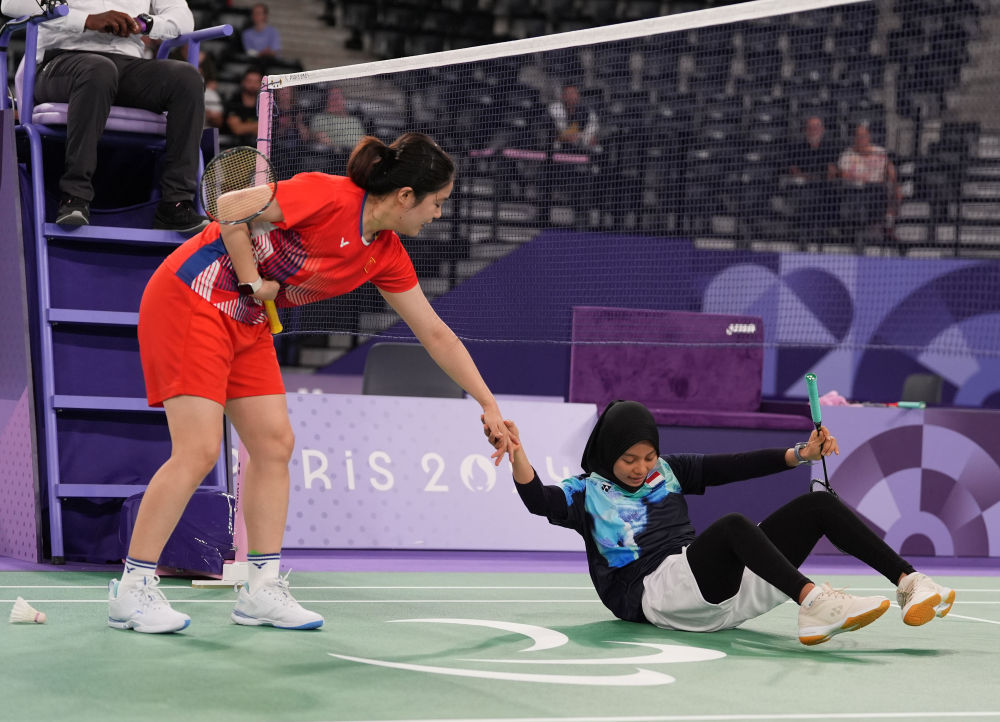 ↑9月2日,中国选手肖祖贤(左)在羽毛球女子单打SL3级决赛中扶起摔倒的对手、印度尼西亚选手沙库尔奥。新华社记者 邢广利 摄