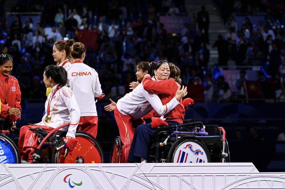 ↑9月7日,轮椅击剑女子重剑团体赛冠军中国队的邹绪凤(右二)在颁奖仪式后和季军泰国队的乍那(右一)拥抱。 新华社记者 张豪夫 摄