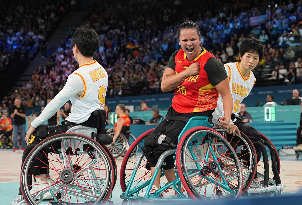 ↑8月30日,在巴黎残奥会轮椅篮球女子小组赛A组第二场比赛中国队对阵西班牙队的比赛中,西班牙队球员洛佩斯庆祝得分。新华社记者 高静 摄