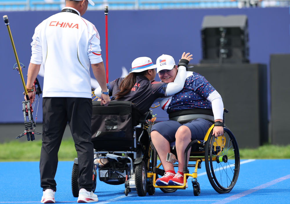 ↑8月31日,射箭女子个人W1级金牌获得者、中国选手陈敏仪(中)赛后与对手、捷克选手普尔塔尔·穆西洛娃(右)拥抱。新华社记者 侯俊 摄