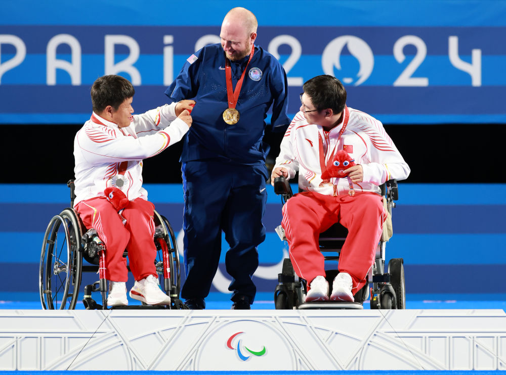 ↑9月5日,在轮椅击剑男子花剑团体颁奖仪式前,巴黎残奥会志愿者推着获得冠军的中国队员沿坡道入场。新华社记者 侯俊 摄