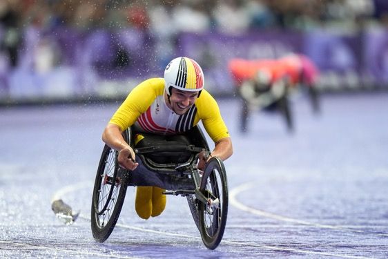 ↑8月30日,比利时选手卡宾在田径男子400米T52级决赛中冒雨前行。新华社记者 张铖 摄