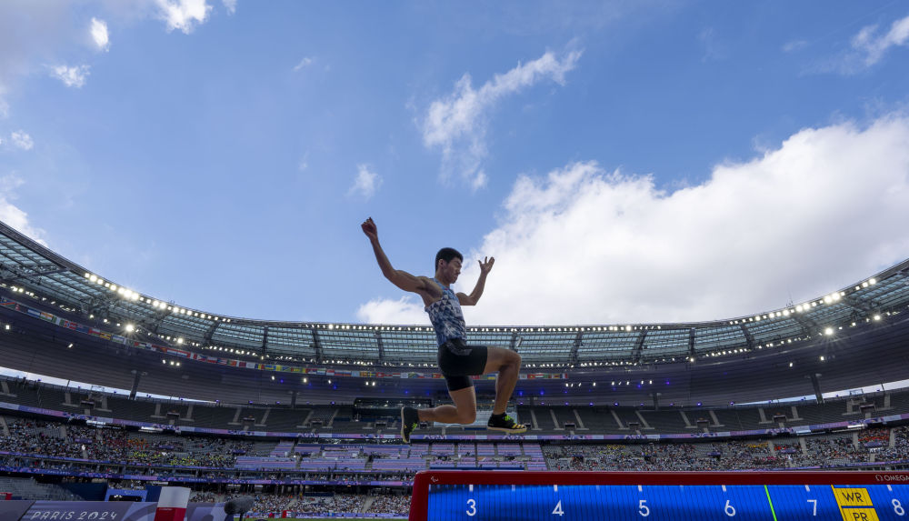 ↑9月4日,中国选手衷黄浩在田径男子跳远T38级决赛奋力一跃,最终获得亚军。 新华社记者 才扬 摄