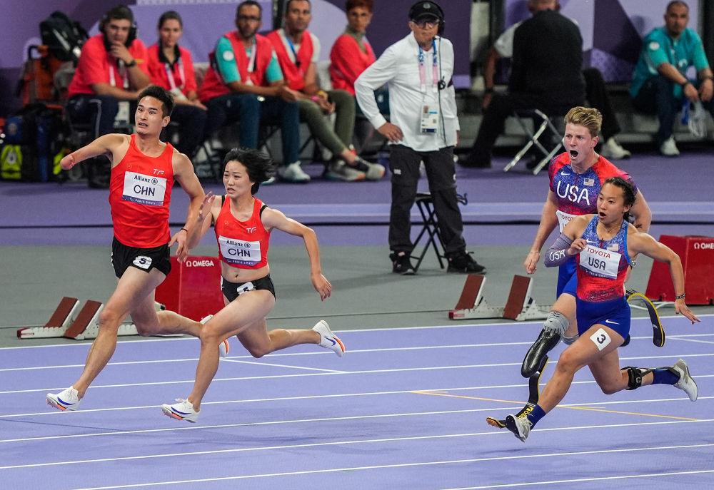 ↑9月6日,参加田径4X100米混合接力的中国队第二棒选手王浩(左一)与队友文晓燕(左二)在比赛中接力。新华社记者 彭子洋 摄