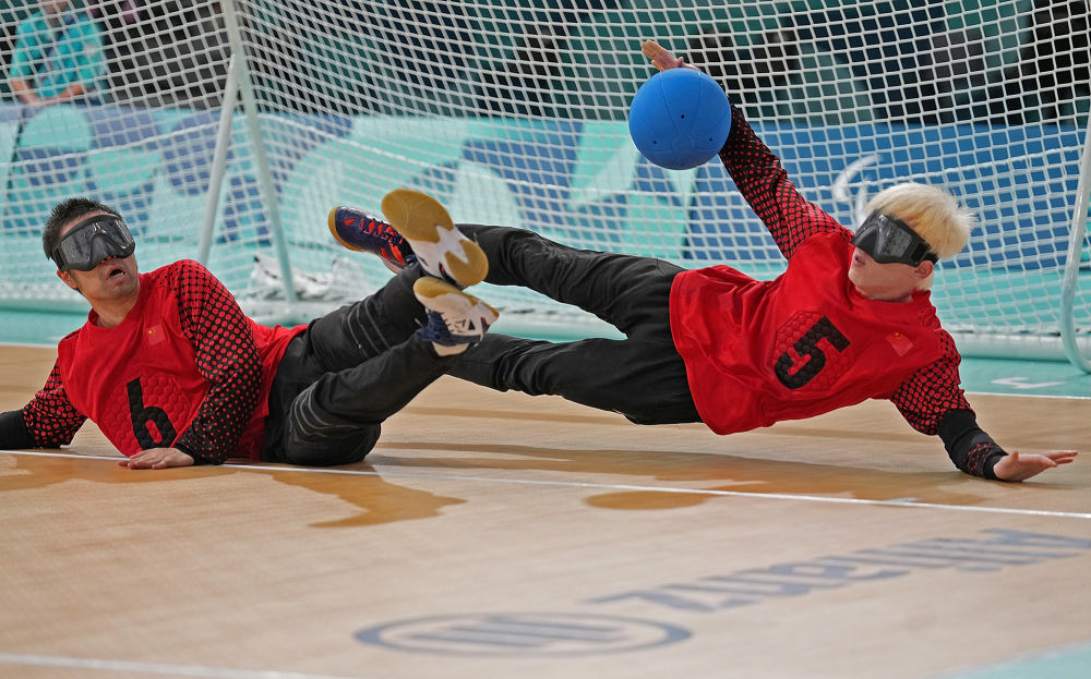 ↑9月2日,中国队球员胡明耀(右)、余钦权在盲人门球男子四分之一决赛中奋力防守。 新华社记者 侯昭康 摄