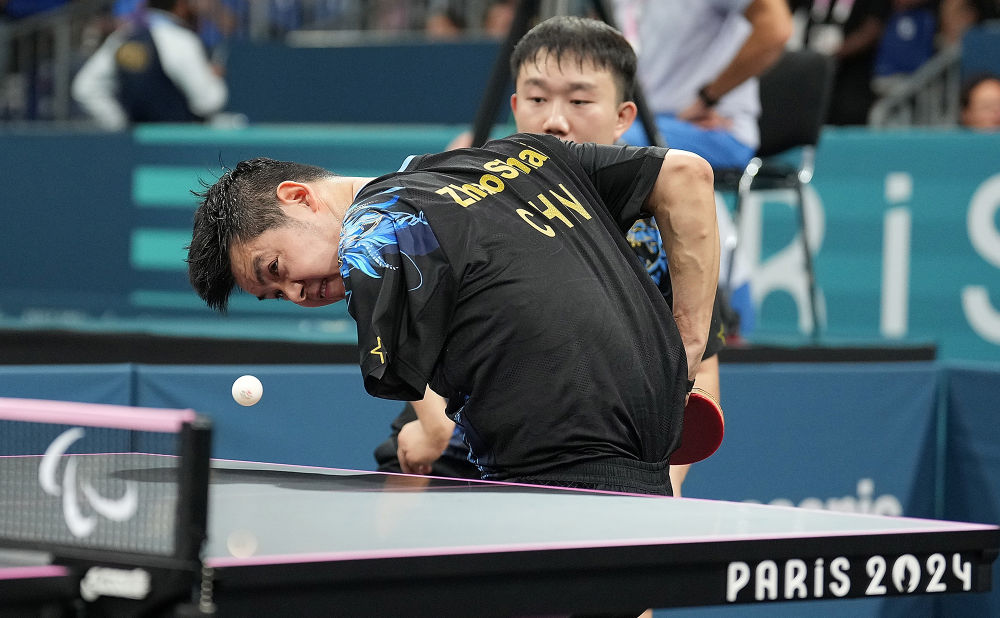 ↑8月29日,中国组合连浩/赵帅(前)在乒乓球男双18级16强比赛中。新华社记者 侯昭康 摄