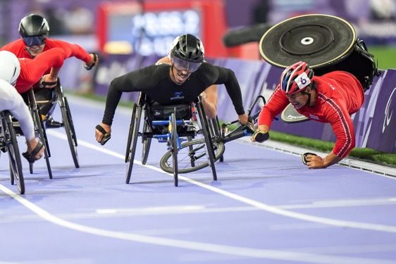 ↑8月31日,泰国选手普塔雷·孔叻(右一)在田径男子5000米T54级决赛中摔倒。 新华社记者 张铖 摄