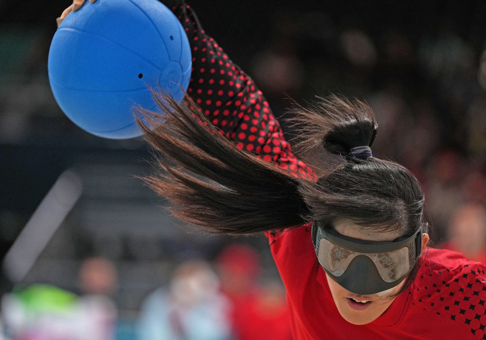 ↑9月3日,中国队球员王春艳在盲人门球女子四分之一决赛中投球。新华社记者 侯昭康摄