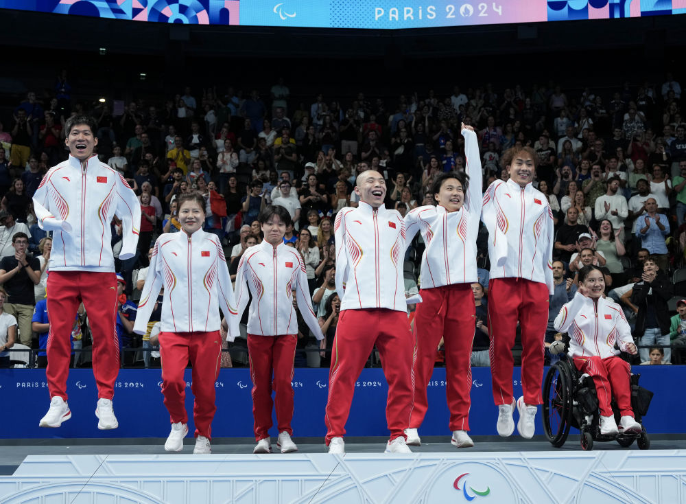 ↑8月30日,中国队选手王李超、卢冬、何聖羔、郭金城、蒋裕燕、袁伟译、彭秋萍(从左至右)在颁奖仪式上庆祝。在游泳男女混合4x50米自由泳接力20分决赛中,中国队以2分14秒98的成绩夺冠,并打破世界纪录。新华社记者 张豪夫 摄