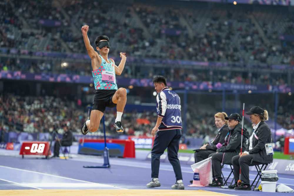 ↑8月30日,中国选手邸东东夺得田径男子跳远T11级别冠军,打破尘封十年的世界纪录。 新华社记者 黄伟 摄